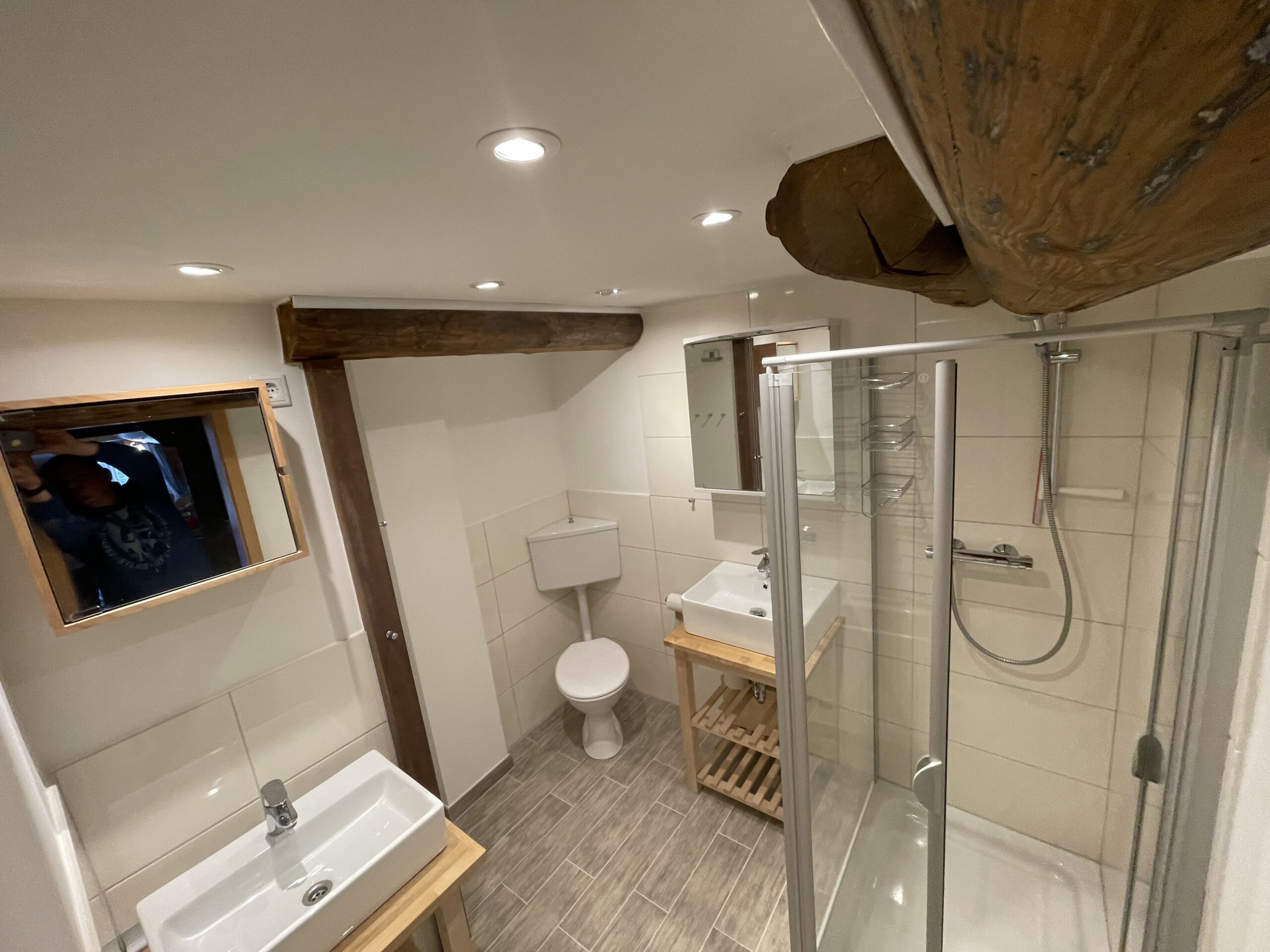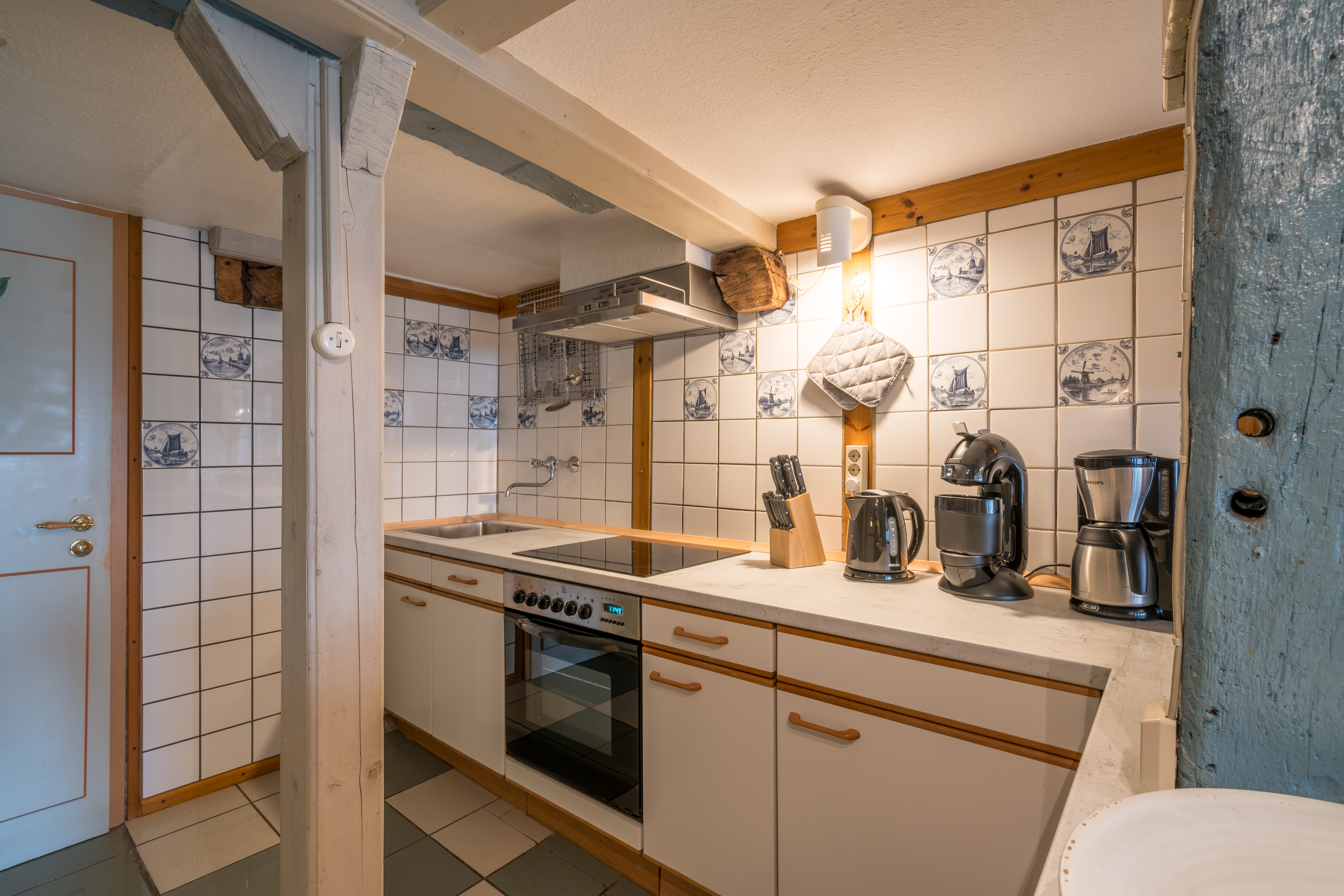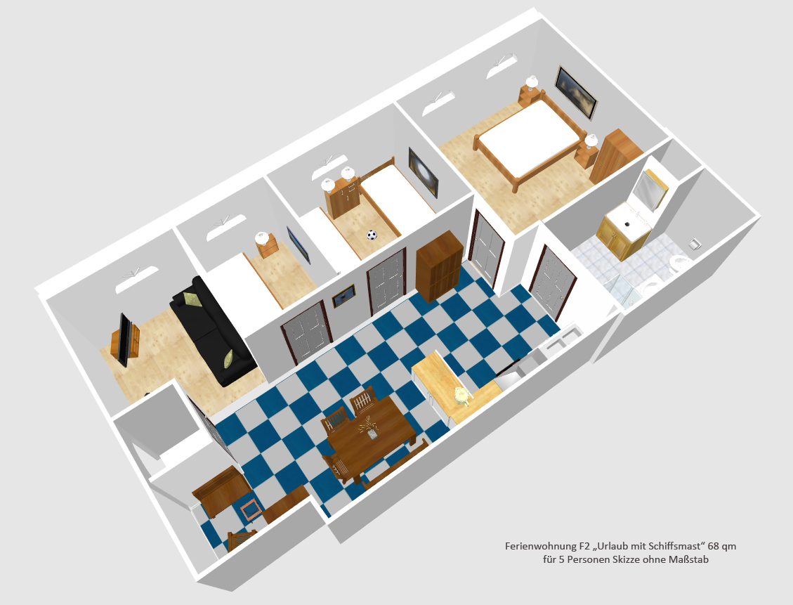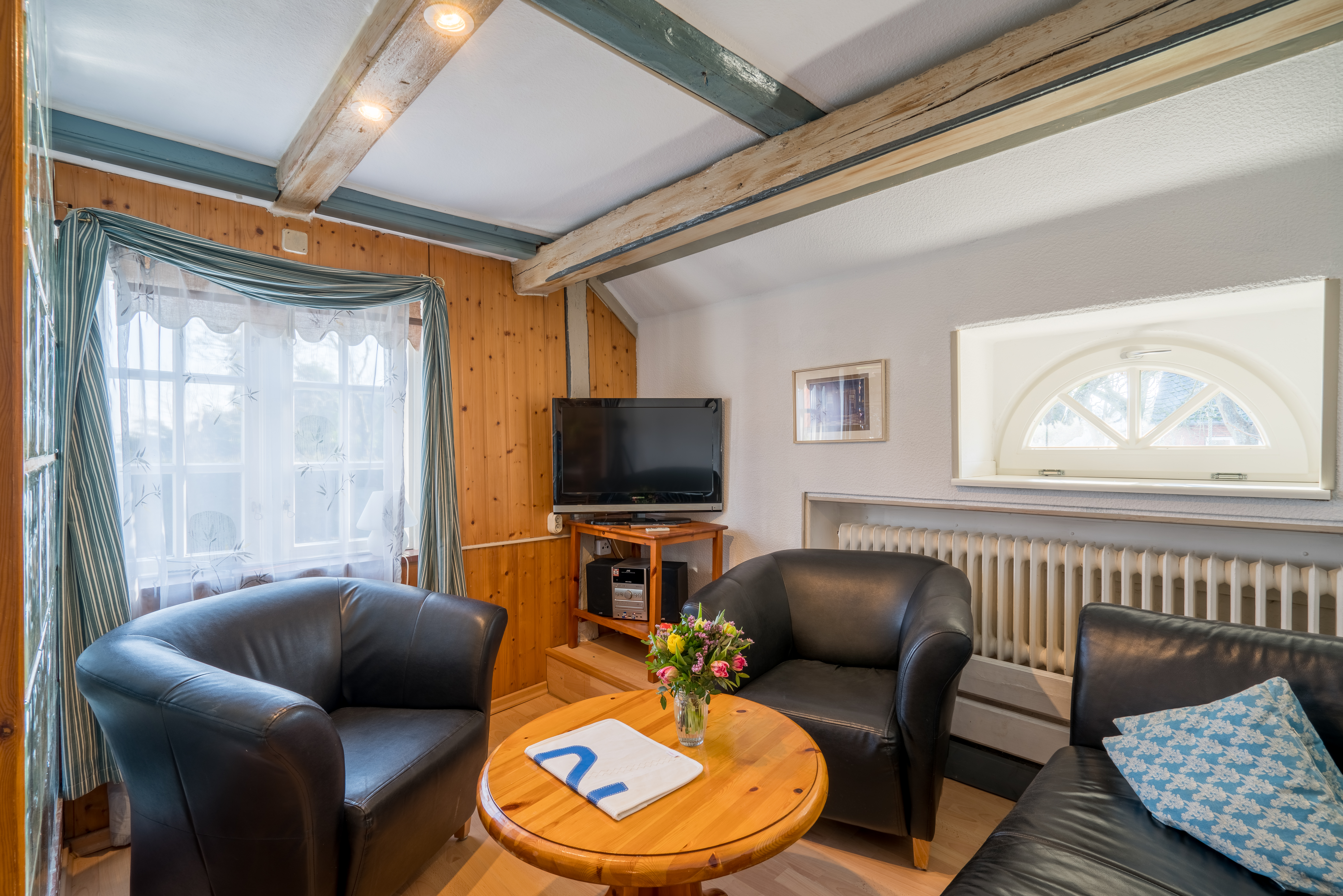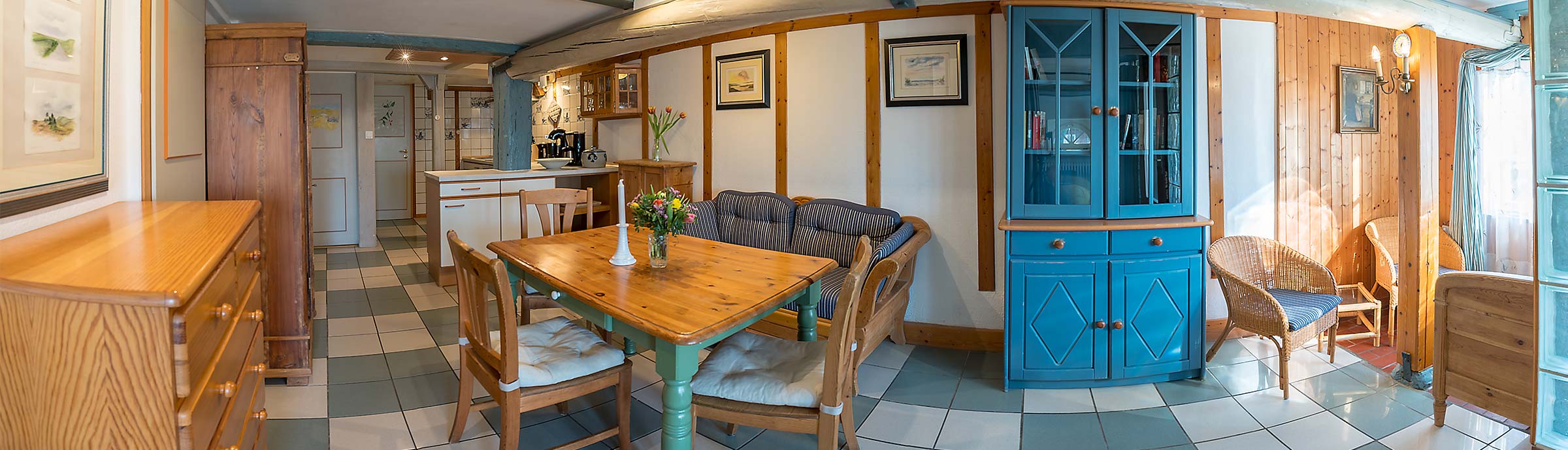 Die Ferienwohnung F2 ist im Erdgeschoss gen Süden gelegen. Sie bietet Ihnen großzügigen Wohnraum durch den sich ein ca. 300 Jahre alter Schiffsmast zieht. Er wurde beim Bau des Hauses als tragender Balken eingesetzt.