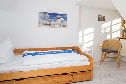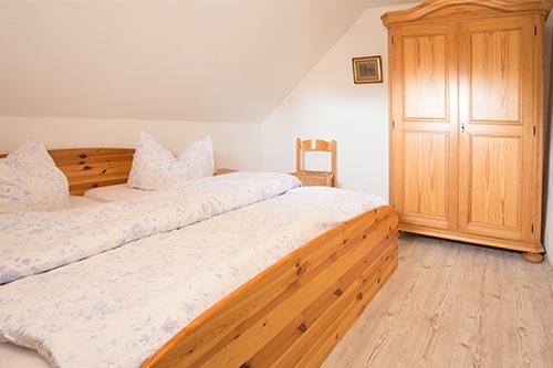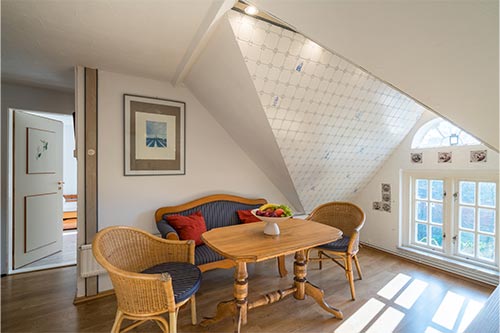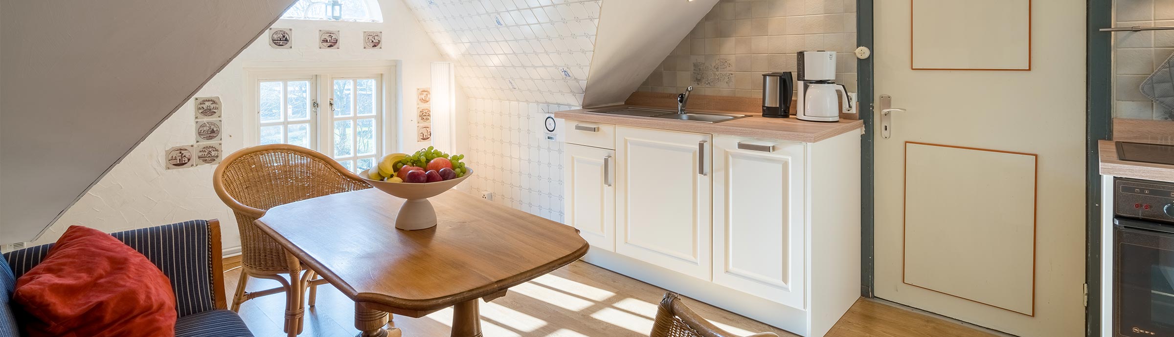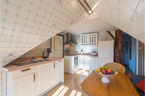 Die Ferienwohnung F3 ist im Obergeschoß gen Westen gelegen. Sie bietet Ihnen eine historisch nachempfundene Wohnküche im Dachgiebel. Einer der tragenden „Ständer“-Balken wurde aufwendig freigelegt und vermittelt ein uriges Wohngefühl.