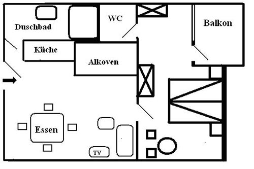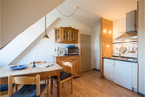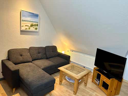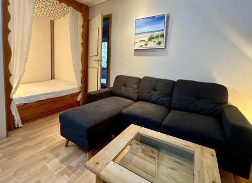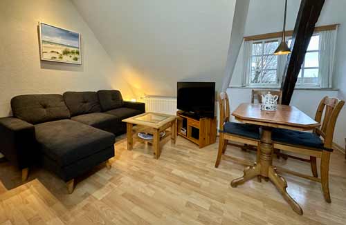 Die Ferienwohnung F 5 ist im Obergeschoß gen Osten gelegen. Sie bietet Ihnen großzügige Räumlichkeiten und eine fantastische Aussicht über die Fennen gen Westerhever Leuchtturm. Einige der tragenden Balken wurden aufwendig freigelegt und vermitteln so ein uriges Wohngefühl. Ein “Alkoven” bietet die Möglichkeit besonders gemütlich zu nächtigen.