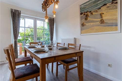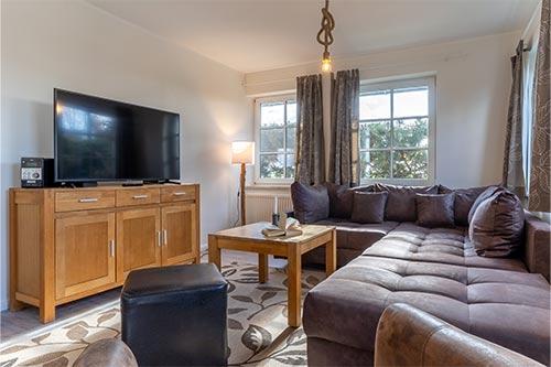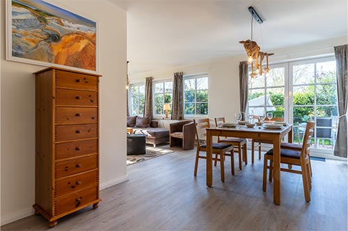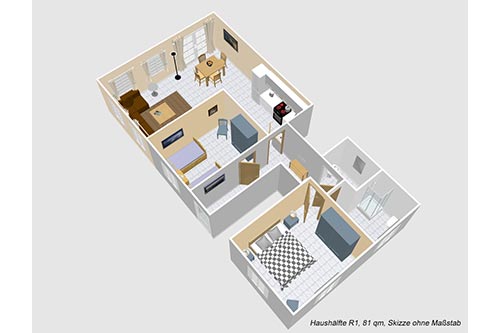 Die Luxus Haushälfte R1 ist im Erdgeschoß, zur Südwestseite gelegen. Sie bietet Ihnen großzügige, helle Räume mit stilvoller Einrichtung und allem Komfort, den Sie für einen schönen Urlaub benötigen. Eine eigene Terrasse mit Strandkorb lädt zum Sonnen und Entspannen ein.