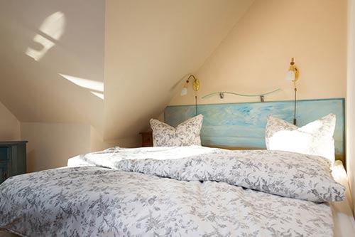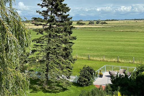 Die Ferienwohnung R2 ist im Obergeschoß, zur Südwestseite gelegen. Sie bietet Ihnen großzügige, helle Räume mit stilvoller Einrichtung und allem Komfort, den Sie für einen schönen Urlaub benötigen. Der Ausblick über die nordfriesische Marschlandschaft ist grandios.